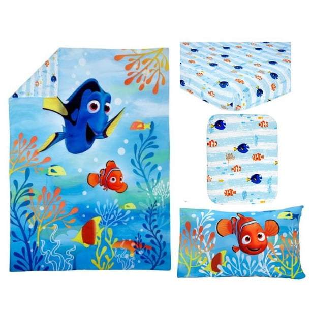 Nemo's reef 4 piece crib bedding set. Disney baby finding nemo a day at the sea 3 pc nursery crib bedding set newfrom $44.99. The comforter is a gorgeous picture of nemo and his friends swimming around the reef area waiting to meet your little one. Comforter measures 42 x 33. Sheet fits a standard size 28 x 52.